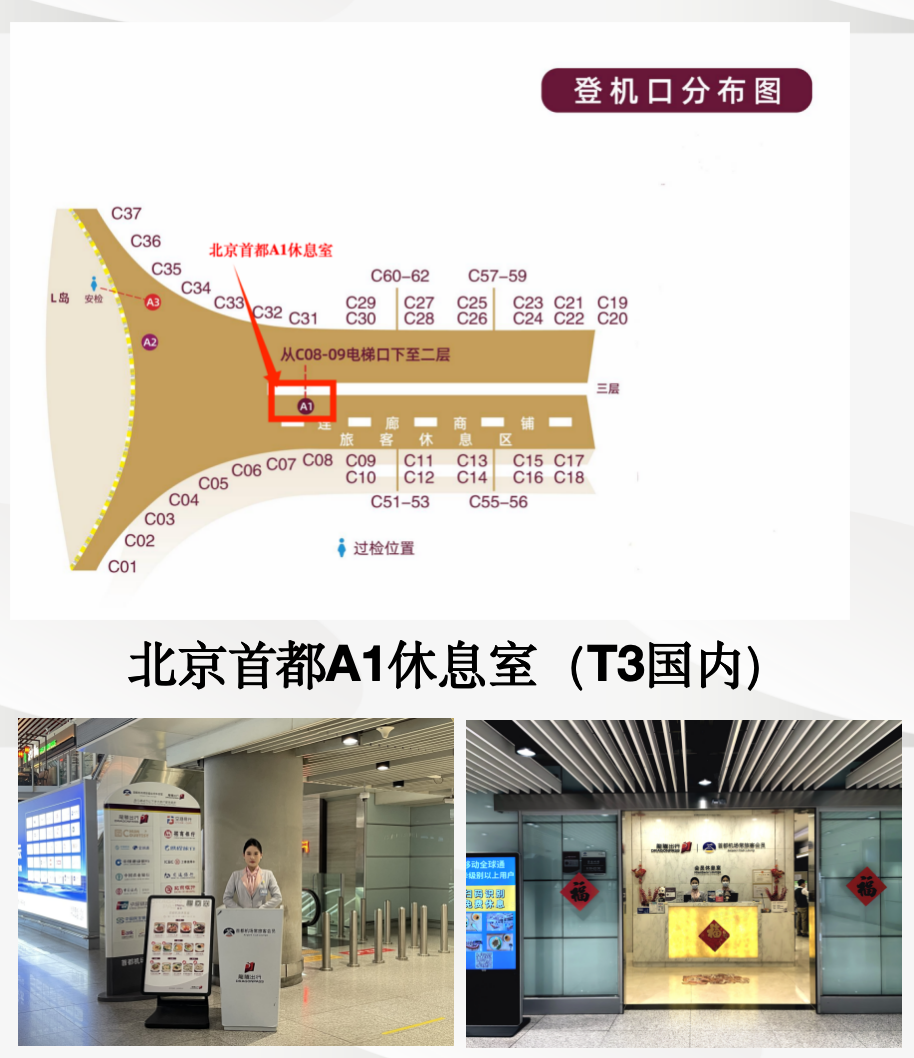 Terminal 3Domestic Departure2FNear Boarding Gate: C08-C18Airside - After passport control and security check, take the first escalator on the right hand side of the boarding gate of C08 - C18 (side of Swarovski), take the escalator down to the second floor of the "Airport Easy A1 Lounge".